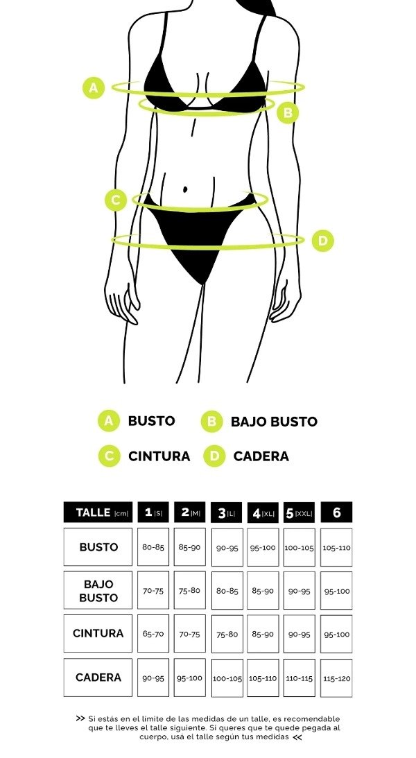 Top escote redondo con breteles chatos regulables, desmontables en la espalda (se pueden usar rectos o cruzados), y espalda abierta. Broche metálico en la espalda. Incluye tazas desmontables.